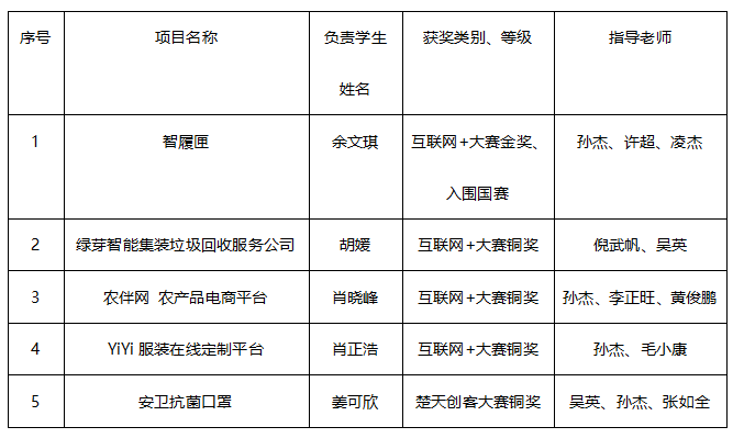 本届大赛由湖北省教育厅、省统战部、省网信办、省发改委、省经信委、省人社厅、省农村农业厅、省知识产权局、省扶贫办及团省委等十部门主办,湖北工业大学承办,中国建设银行湖北省分行冠名支持,赛链云平台提供技术服务支持。来自全省84所学校188个项目进行省赛现场决赛,最终,在公司领导的高度重视和一批优秀教师的辛勤指导下,共获得金奖1项,铜奖3项的优异成绩;同时,还举行了湖北省第三届“我梦见——楚天创客”大赛,公司有1个项目获得铜奖,据统计,公司获奖数量及成绩在学校名列前茅,具体名单如下: