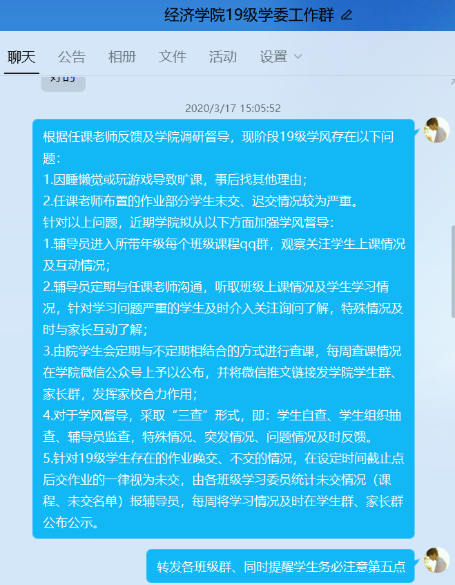 针对调研反馈的员工作业迟交晚交情况,学院将采取每周作业完成情况年级员工群家长群公示制度;针对调研反馈的员工课程迟到未到情况,学院将采取“员工自查+员工组织抽查+辅导员监查+任课老师考查”“四查”形式来进一步加强线上学风督导。