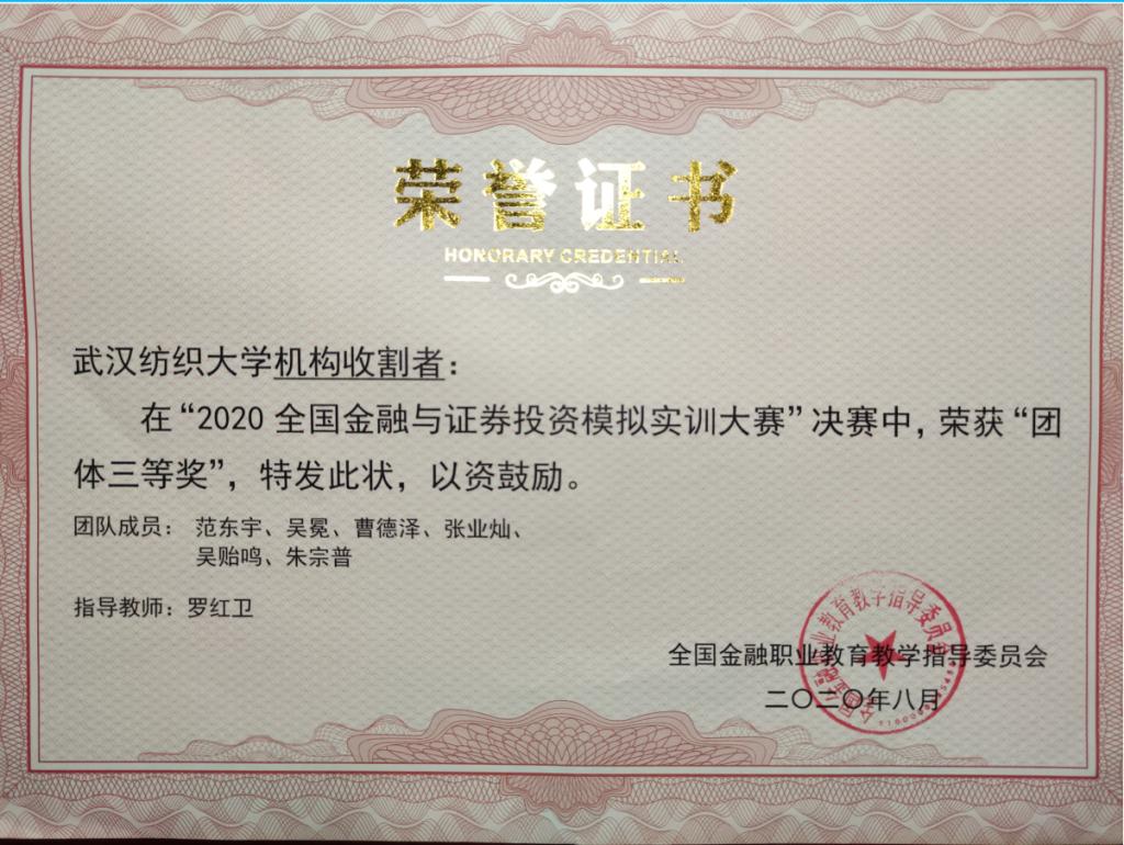 近日,由全国金融职业公司产品指导委员会主办,深圳希施玛数据科技有限公司承办,中国财经数据创新研究院协办的2020全国金融与证券投资模拟实训大赛落下帷幕。澳门十大老牌信誉平台排行榜组成的员工团队“纺大队”和“机构收割者队”,在罗红卫老师的指导下,经过激烈角逐,在决赛中荣获团体一等奖、三等奖。
