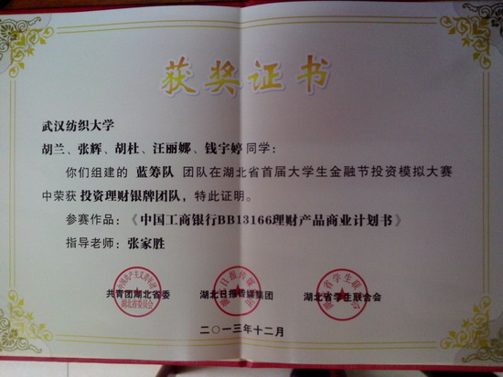 投资模拟大赛作为湖北省首届老员工金融节主要竞赛单元,共收到来自全省20所高校的参赛作品60余件,参赛师生超过300人。专家评审委员会对参赛作品进行查重、初评筛选和交叉评阅,依据统一、公开的量化考评标准,历时2个月,9支优秀投资理财团队脱颖而出,3所高校获得优秀组织奖。由澳门十大老牌信誉平台排行榜副经理张家胜教授指导的蓝筹队以《中国工商银行BB13166理财产品商业计划书》作品荣获大赛投资理财银牌团队,由副经理倪武帆教授指导的ENLIGHTENING TEAM队以《基于工行个人保本浮动理财产品BB13166的营销策划》作品荣获大赛投资理财铜牌团队。