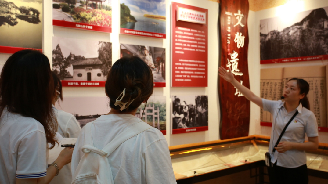 在蔡甸街道新时代文明实践中心——“红房子”爱国主义教育基地,“为人民服务”这几个鲜红的大字深深吸引住实践队员。走进中心展览室,通过一张张老照片、一段段质朴文字介绍,队员深入了解蔡甸区的历史轨迹和发展历程,感受到了蔡甸区所蕴含的码头文化、知音文化、红色文化和家风文化。