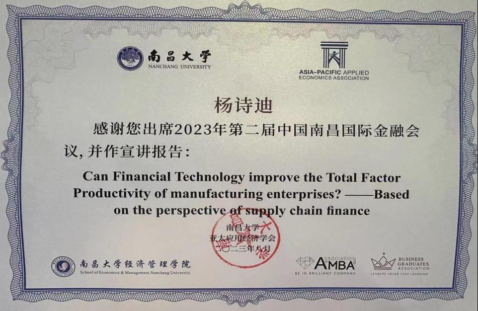 倪武帆教授8月25日带队22级研究生杨诗迪、23级研究生邱瑾怡赴南昌大学参会。8月26日下午,杨诗迪在主题为“FinTech&Inclusive Finance”的分会场进行了研究的成果展示,并就相关研究的背景、实证方法过程、结论等内容作了专题报告。该研究成果以提升制造业全要素生产率为目的,揭示了制造业面临产业链上下游供需错配、创新能力不强以及中小微企业面临融资约束等问题,从供应链金融视角,发挥金融科技的“普惠金融”功能,优化制造业上下流企业供需匹配和供应质量,提升企业“投入-产出”效率。杨诗迪的报告精炼、流畅,得到了与会专家的一致好评。同时,杨诗迪还作为点评嘉宾,点评了来自厦门大学的《Can Digital Inclusive Finance Support the Rationalization of China’s Industrial Struture?》专题报告,在点评环节中,杨诗迪从宏观角度提出,基于供给侧的鲍莫尔效应,通过增加创业机会、加大研发投入,鼓励科技创新和需求侧的恩格尔效应,缩小城乡收入差距,释放内需潜力等角度完善数字普惠金融与产业结构合理化之间的传导机制,得到与会专家学者充分肯定与积极评价。